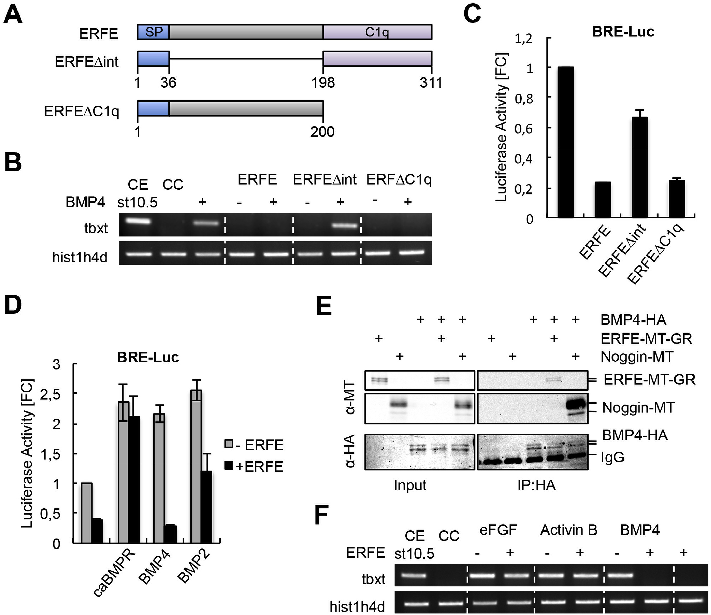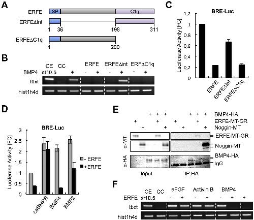 Fig. 3. ERFE selectively inhibits BMP signaling at the extracellular level and the conserved C1q domain is not required for this activity. A-C. Deletion of the C-terminal C1q domain does not affect the BMP antagonizing activity of ERFE. A. Schematic representation of the full length ERFE protein and ERFE-related deletion mutants. The numbers of amino acid residues are indicated. SP - signal peptide; C1q - C1q domain. B. 100 âpg erfe, 100 âpg erfeÎint, 100 âpg erfeÎC1q, and 1 âng bmp4 mRNAs were injected animally into both blastomeres at the two-cell stage and ectodermal explants were isolated at stage 8/9. Total RNA employed for RT-PCR was extracted at the equivalent of stage 10.5. CE â uninjected control embyro; CC - naïve control caps. C. Embryos were injected with 100 âpg erfe, 100 âpg erfeÎint, 100 âpg erfeÎC1q, and the BRE-Luc reporter construct marginally into the two ventral blastomeres at the four-cell stage and analyzed by luciferase reporter assays at stage 11. Data were averaged from three independent experiments and normalized against endogenous BMP signaling activity (s.e.m. is indicated). D. ERFE does not repress BMP reporter gene activity induced by caBMPR and inhibits BMP4 more efficiently than BMP2. mRNAs (1 âng cabmpr, 1 âng bmp4, 1 âng bmp2 and 100 âpg erfe) were injected together with the BRE-Luc reporter marginally into the two dorsal blastomeres at the four-cell stage and embryos were analyzed as described in panel C. E. ERFE interacts with BMP4. Co-Immunoprecipitation experiment showing co-precipitated proteins in the right panels and Xenopus lysates used for immunoprecipitation in the left panels. Embryos were injected with 200 âpg erfe-MT-GR, 200 âpg noggin-MT, and 1 âng bmp-HA mRNAs animally into both blastomeres at the two-cell stage and lysed at stage 11 for CoIP using anti-HA antibody. Embryo lysates and CoIP samples were analyzed by Western Blot using anti-HA and anti-MT antibodies, as indicated. Injected constructs are indicated at the top, antibodies used for Western Blot on the left. Noggin-MT served as control for BMP4 interacting proteins. IgG - immunoglobulin. F. ERFE blocks BMP4, but not eFGF or Activin B-induced tbxt induction. 10 âpg efgf, 1 âpg activin b, 1 âng bmp4, and 100 âpg erfe mRNAs were injected as indicated and ectodermal explants were processed as described in panel B. |