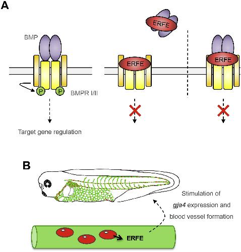 Fig. 7. Schematic reflection of ERFE as a secreted BMP antagonist and positive regulator of vascular development. A. In the absence of extracellular BMP antagonists, a BMP dimer (purple) forms a hetero-hexameric complex with BMP type I (yellow) and type II receptors (orange) leading to autophosphorylation of the type I receptor. ERFE is a secreted BMP antagonist that can interact with both the BMP ligand and, most likely, the BMP type I receptor, suggesting different modes of action for ERFE-mediated BMP antagonism. ERFE could bind and inactivate the complex of BMP proteins and BMP receptors. Alternatively, ERFE could bind the BMP ligand or BMP-receptors and prevent ligand/receptor interaction. B. During development, primitive erythrocytes produce ERFE protein that promotes the formation of a functional vasculature, potentially by stimulating the expression of the vascular gap junction component Gja4. |