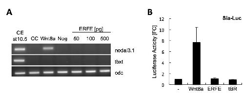 Fig. S2. ERFE does not stimulate canonical Wnt signaling activity. A. The direct Wnt/β-Catenin target gene nodal3.1 is not induced by ERFE in animal cap explants. Two-cell stage embryos were injected with 30 pg wnt8, 300 pg noggin, or 50 pg, 100 pg or 500 pg erfe mRNA animally into both blastomeres. Ectodermal explants were isolated at stage 8/9 and grown to the equivalent of stage 10.5, total RNA was extracted and analyzed by RT-PCR. B. ERFE does not activate canonical Wnt reporter gene activity. mRNAs (20 pg wnt8, 250 pg truncated bmp receptor (tBR) or 120 pg erfe) were injected animally into both blastomeres at the two-cell stage and embryos were analyzed at stage 11 by luciferase reporter assays. Data were averaged from three independent experiments and normalized against endogenous Wnt/β-Catenin signaling activity (s.e.m. are indicated). |