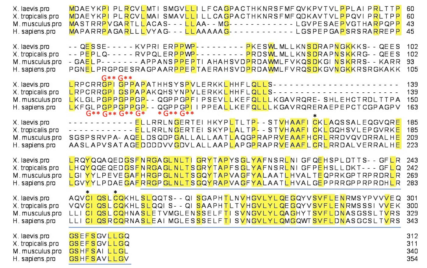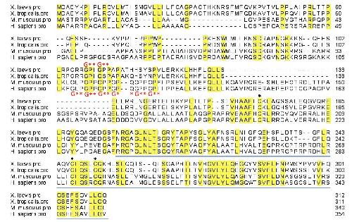 Fig. S3. Sequence comparison of vertebrate ERFE proteins. Sequence alignment of ERFE proteins from Xenopus laevis (XP_018119361), Xenopus tropicalis (NP_001072387), Mus musculus (NP_775571), and Homo sapiens (NP_001278761) was generated using ClustalW. Conserved residues are highlighted in yellow. Conserved cysteine residues are labled with a black asterisk. The C-terminal highly conserved C1q domain is underlined (blue line). Collagenic repeats within the Xenopus and mammalian protein sequences are indicated (G**). |