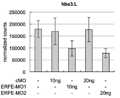 Fig. S6. Expression of embryonic globin subunit hba3 is moderatly reduced upon erfe knockdown. ERFE-MOs or a standard control morpholino (cMO) were injected marginally into all four vegetal blastomeres of eight-cell stage embryos. Amounts of injected MOs are indicated. Total RNA of 5 stage 41 embryos each was extracted and expression levels of hba3 was determined by Nanostring nCounter analysis. The graphs show the averaged normalized counts from 3 independent experiments, and s.e.m. are indicated for each column. |