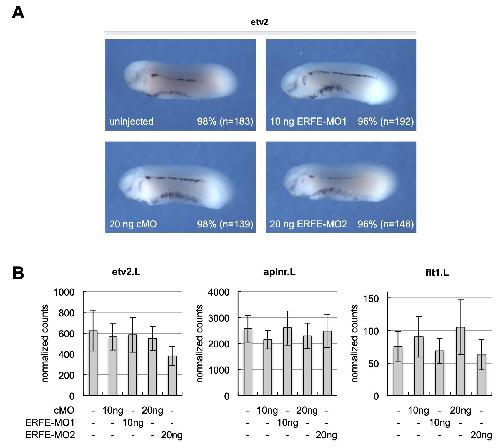Fig. S8. Specification of vascular cells is not affected upon erfe knockdown. A-B. Expression of vascular specification markers is not significantly changed in ERFE morphant embryos. Embryos were injected with ERFE-MOs or a standard control morpholino (cMO) marginally into all four vegetal blastomeres at the eight-cell stage and cultivated until stage 26. Amounts of injected MOs are indicated. A. etv2 expression was determined by WMISH. Representative embryos showing etv2 expression in endothelial precursor cells. Percentages of embryos exhibiting the shown phenotype in respect to the whole number of analyzed embryos is shown in the lower right hand corner of each panel. B. Total RNA of 5 embryos each was extracted and expression levels of the early endothelial genes etv2, aplnr, and flt1 were determined by Nanostring nCounter analysis. The graphs show the averaged normalized counts from 3 independent experiments, and s.e.m. are indicated for each column. |