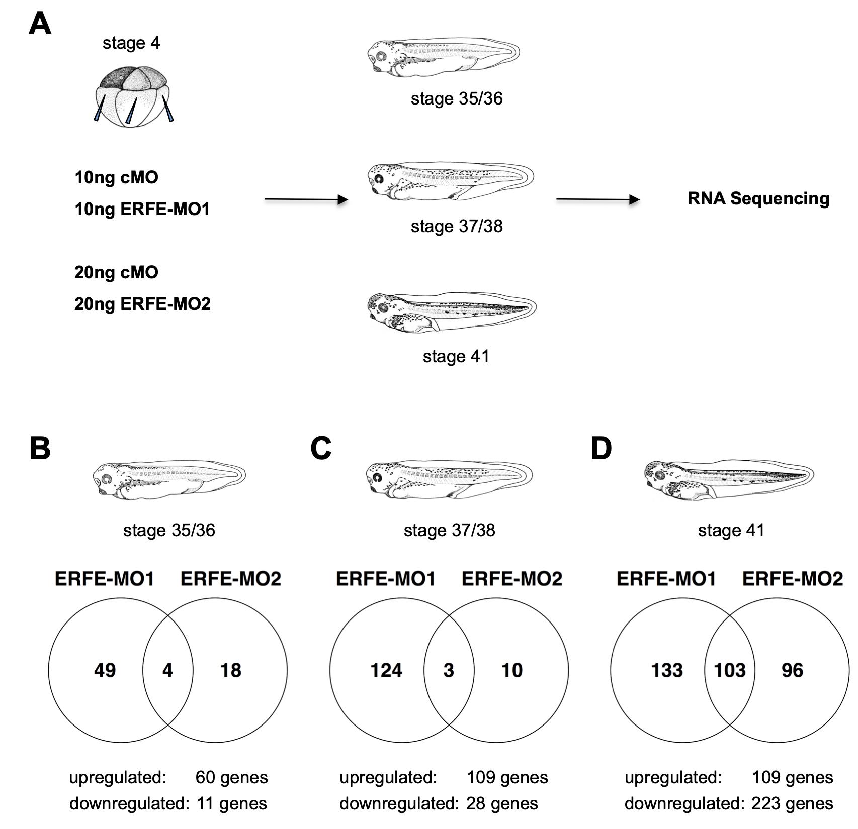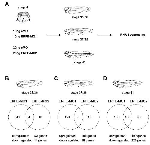 Fig. S9. Analysis of ERFE-MO-injected embryos by RNA-Sequencing was carried out to uncover the role of ERFE during Xenopus embryogenesis. A. ERFE-MOs or a standard control morpholino (cMO) were injected marginally into all four vegetal blastomeres at the eight-cell stage. Amounts of injected MOs are indicated. At stages 35/36, 37/38, and 41 total RNA was isolated from five embryos each and RNA samples from three independent experiments were subjected to RNA-sequencing analysis. B-D. Venn diagramms illustrating the numbers of genes differentially expressed using an absolute log2 fold- change >1 and FDR-corrected p-value <0.05 upon injection of ERFE-MO1 and ERFE-MO2 compared to uninjected and corresponding cMO-injected embryos at stages 35/36 (B), 37/38 (C), and 41 (D). Numbers of upregulated and downregulated genes are indicated. |