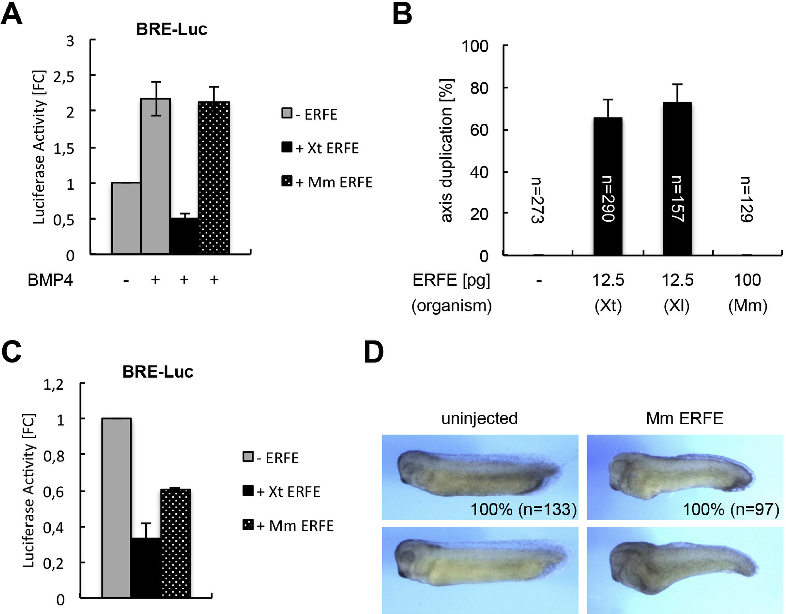 Fig. 2. Xenopus and murine ERFEs differ in BMP specificity their ability to modulate primary axis formation. A, C. 1 âng bmp4, 100 âpg murine or Xenopus tropicalis erfe mRNA and the BRE-Luc reporter construct were injected, as indicated, marginally into the two dorsal blastomeres at the four-cell stage and analyzed by luciferase reporter assays at stage 11. Data were averaged from at least 3 independent experiments and normalized against endogenous BMP signaling activity (s.e.m. is indicated). A. BMP4-induced signal transduction is not affected by coexpression of murine ERFE. B, D. Four-cell stage embryos were injected marginally into one ventral blastomere, in three independent experiments. B. Both Xenopus tropicalis and laevis versions of ERFE stimulate secondary axis formation, while murine ERFE does not. Amounts and sources of injected erfe RNAs, number of injected embryos, and s.e.m. are indicated. C. Both Xenopus and murine ERFE inhibit endogenous BMP signaling activity at gastrula stage. D. Overexpression of murine ERFE induces a mild dorsalization phenotype. Representative embryos showing normal axis development in the left or moderate dorsalization upon murine ERFE overexpression in the right panel. Embryos were injected with 100 âpg murine erfe mRNA. The penetrance of the phenotype (% of all embryos) and numbers of embryos analyzed (n) are indicated A-D. Xt - Xenopus tropicalis; Xl - Xenopus laevis; Mm - Mus musculus. |