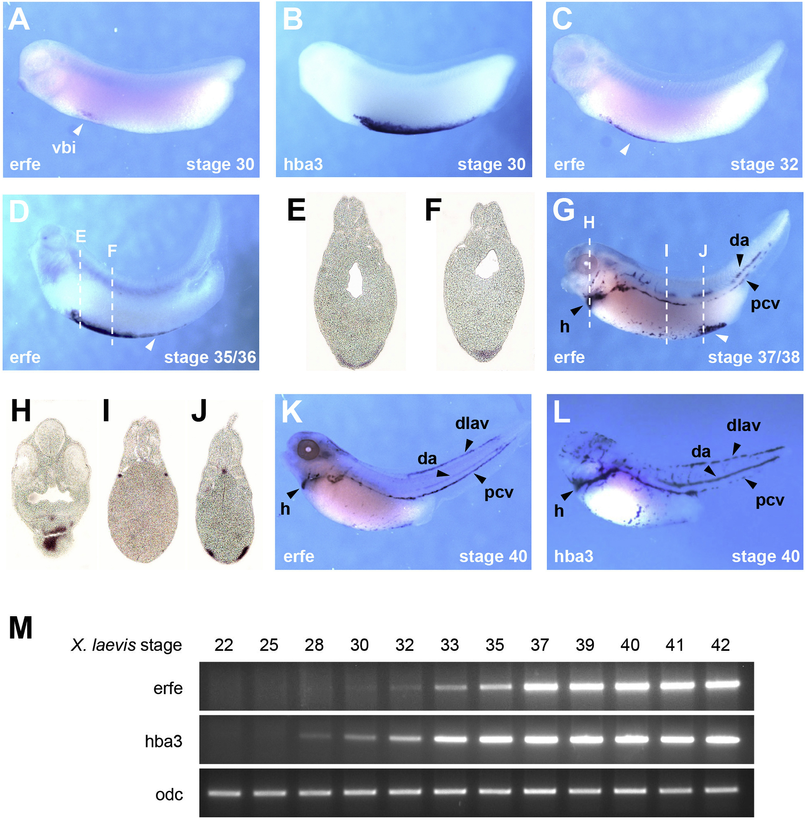 Fig. 4. ERFE is expressed in the ventral blood islands and in circulating primitive blood cells. A-L. The spatio-temporal expression of erfe was determined by whole-mount in situ hybridization and compared to that of hba3. Embryonic stages and probes used are indicated in the lower left corner. A. Erfe transcripts are first detected at stage 30 within the anterior domain of the ventral blood islands (vbi). B. At the same stage, hba3 expression extends to the posterior end of the vbi. C-D. erfe expression in the vbi (white arrowhead) expands posteriorly, overlapping with the vbi. E-F. Transverse sections of a stage 35/36 embryo stained for erfe expression. Dashed lines in panel D indicate the levels of sections. G. At stage 37/38, erfe expressing cells are no longer exclusive to the vbi (white arrowhead) but they are also found within the heart and the dorsal blood vessels. H-J. Transverse sections of a stage 37/38 embryo as shown in panel G. Dashed lines (G) indicate the levels of sections. K-L. erfe and hba3 exhibit overlapping territories of expression within the heart and the main blood vessels. da - dorsal aorta; dlav - dorsal longitudinal anastomotic vessel; h â heart; pcv - posterior cardinal vein; vbi â ventral blood islands. M. The onset of hba3 expression precedes the induction of zygotic erfe expression. Total RNA was harvested from staged embryos and analyzed by RT-PCR. |