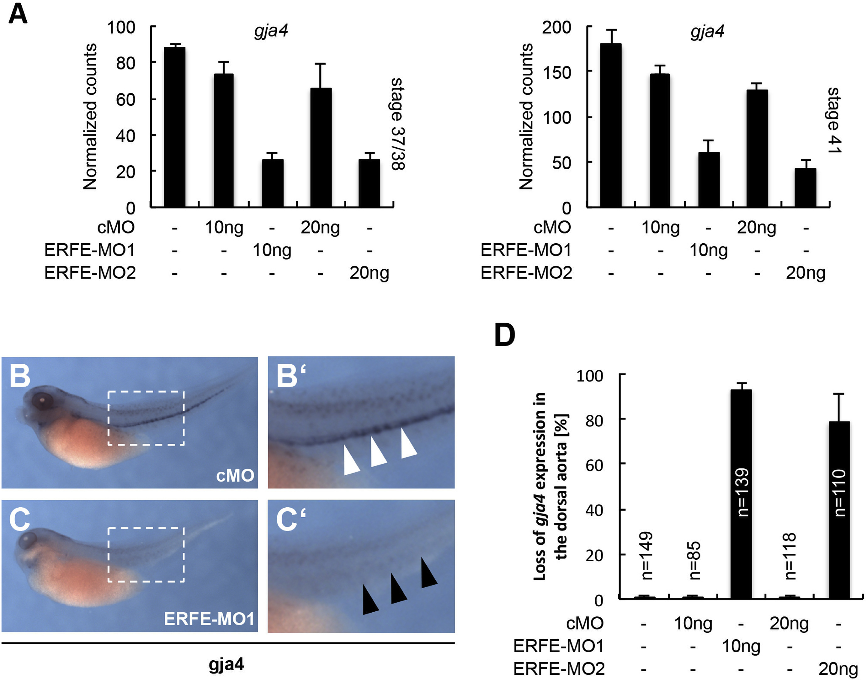 Fig. 6. Erfe knockdown results in a loss of gja4 expression in the dorsal aorta. A-D. Embryos were injected with ERFE-MOs or a standard control morpholino (cMO) marginally into all four vegetal blastomeres at the eight-cell stage. Amounts of injected MOs are indicated. A. RNA-sequencing data (normalized counts) for gja4 expression upon erfe LOF at stage 37/38 and stage 41. Total RNA was isolated from five embryos each and subjected to RNA-sequencing analysis. The graphs summarize data from three biological replicates. B-D. Verification of gja4 as an ERFE regulated gene. gja4 expression was determined by WMISH. CâCâ. Representative cMO-injected embryo showing gja4 expression in the dorsal aorta (white arrowheads). D-Dâ. Representative embryo showing a loss of gja4 expression in the dorsal aorta upon ERFE-MO1 injection (black arrowheads). E. Quantification of gja4 expression in the dorsal aorta upon MO-injection. The graphs summarize three independent experiments. Numbers of injected embryos, and s.e.m. are indicated for each column. |