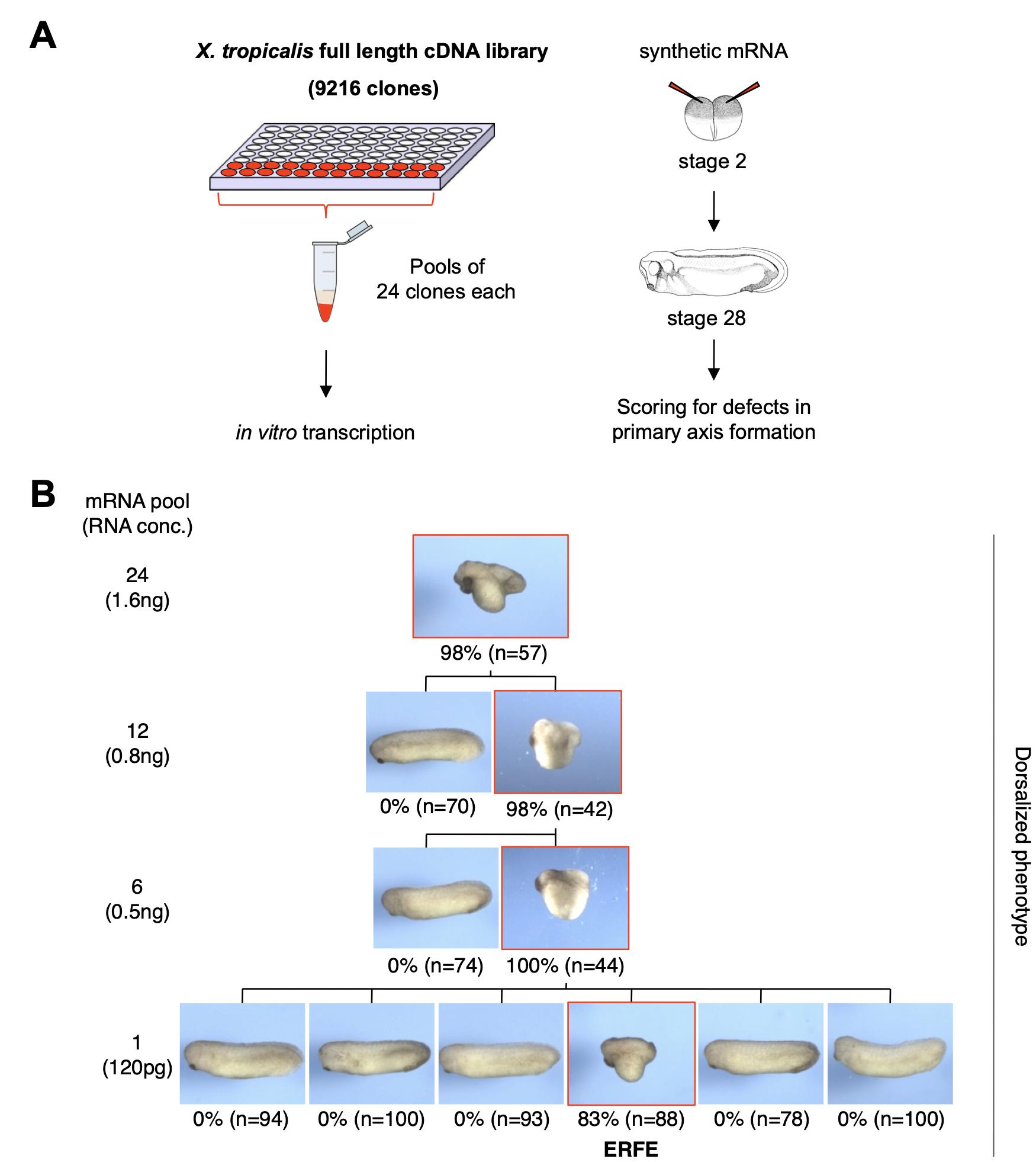 Fig. S1. Identification of ERFE as a dorsalizing factor. A. Pools of mRNAs generated from a Xenopus tropicalis full length cDNA library were injected animally into both blastomeres at the two-cell stage. At tailbud stage, embryos were scored for defects in primary axis formation. B. Embryos were initially injected with pools of 24 mRNAs. The dorsalizing/ axis-inducing pool contained mRNA derived from the following cDNA clones: TTpA072o12, TTpA074b10, TTpA074h13, TTpA075c05, TTpA075j02, TTpA075o18, TTpA076d05, TTpA076k21, TTpA077b02, TTpA078d11, TTpA078h06, TTpA078l11, TTpA073i18, TTpA074b19, TTpA074l15, TTpA075f20, TTpA075l15, TTpA076b06, TTpA076j03, TTpA076l10, TTpA077e08, TTpA078k07, TTpA078m10, TTpA078f11 (ERFE). The mRNA pool was further fractioned to identify the dorsalizing mRNA. The number of individual mRNAs per pool and total RNA concentrations injected are indicated on the left hand side. The penetrance of the phenotype (% of all embryos) and numbers of embryos analyzed (n) are indicated. The red highlighted phenotypes are derived from mRNA pools containing ERFE. |