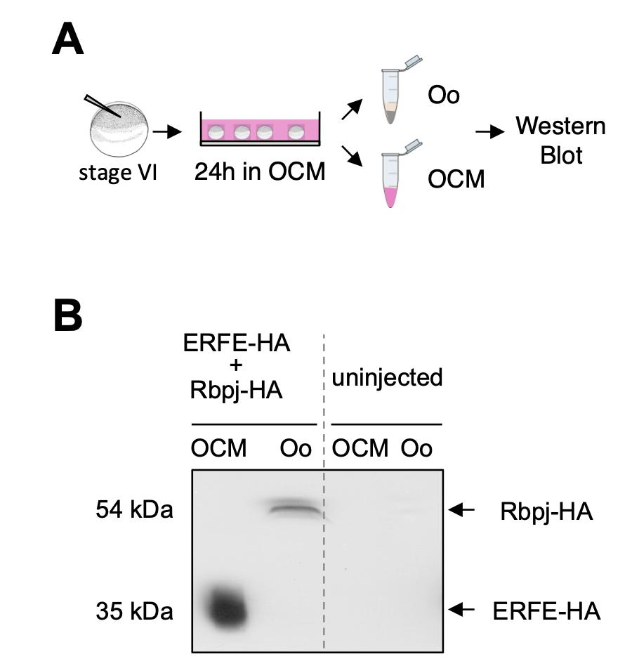 Fig. S4. ERFE is a secreted protein. A. Experimental procedure for the oocyte secretion assay. Stage VI oocytes were injected and cultivated for one day in oocyte culture medium (OCM). Oocyte fraction (Oo) and OCM were separated and protein extracts were analyzed by Western Blot. B. ERFE-HA protein is secreted upon overexpression in Xenopus oocytes. Oocytes were injected with mRNAs coding for hemagglutinin (HA)-epitope tagged versions of ERFE (150 pg) and Rbpj (100pg). The transcriptional regulator Rbpj served as control for non-secreted proteins. The expression of HA-tagged proteins was analyzed using an anti-HA antibody. |