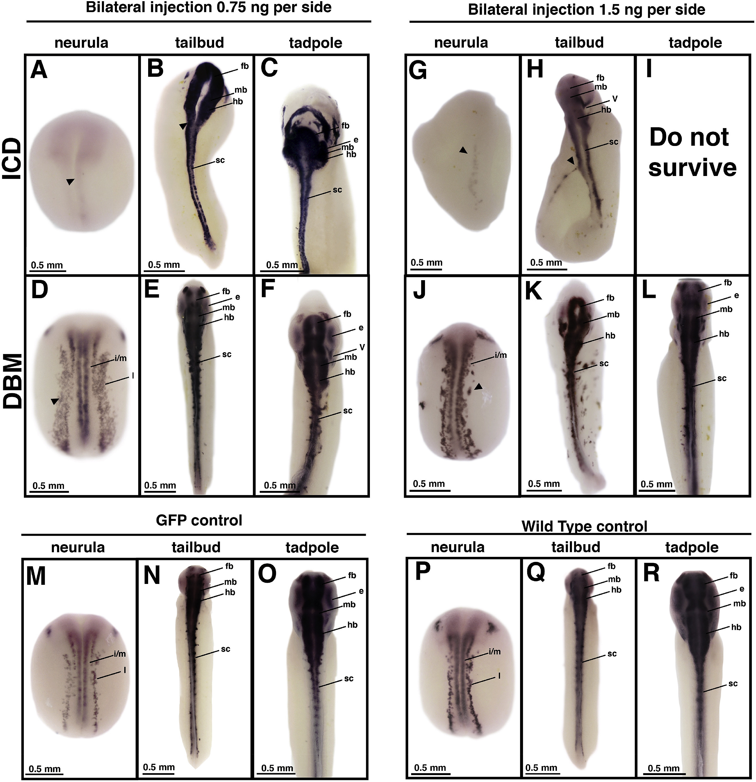 Fig. 3. tubb2b expression in bilaterally perturbed embryos. Embryos were bilaterally injected at the two-cell stage with either ICD (A-C, G-I) or DBM (D-F, J-L) mRNA and reared to desired stages. ICD bilaterally injected embryos demonstrate minimal tubb2b expression at the neurula stage (A,G, arrowhead) and show morphological defects by the tailbud stage (B,H, arrowhead). DBM bilaterally injected embryos show ectopic tubb2b expression at the neurula stage (D,J, arrowhead), but appear to compensate in a gradual manner over time (E-F, K-L). GFP bilaterally injected embryos and wild type remain unperturbed (M-R). Abbreviations: i/m, intermediate/medial longitudinal stripes of primary neurogenesis; fb, forebrain; mb, midbrain; hb, hindbrain; e, eye; sc, spinal cord. For each stage, N = >50 for ICD and GFP, >10 for DBM. Embryos were obtained from a minimum of three different clutches.