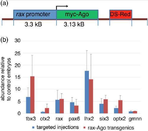 Figure 1. Identification of EFTFs associated with the RISC in the eye field. (a) Construct used for rax1AâmycâAGO transgenesis. (b) QâRTâPCR of AGOâRNPâassociated RNA obtained from raxâAGO transgenic embryos (red; n = 3 independent experiments) and embryos injected with mycâAgo RNA injected into the dorsal animal blastomeres (blue; n = 4 independent experiments). Values are presented as fold abundance relative to coimmunoprecipitations from embryos that do not express mycâAGO, to provide a control for nonspecific binding of RNA. Values represent meanâ±âS.E.M. AGO, Argonaute; EFTFs, eye field transcription factors; QâRTâPCR, quantitative reverseâtranscriptaseâpolymerase chain reaction |
