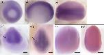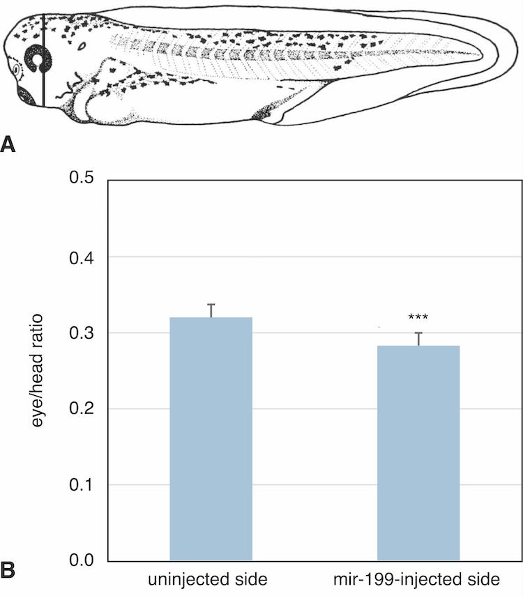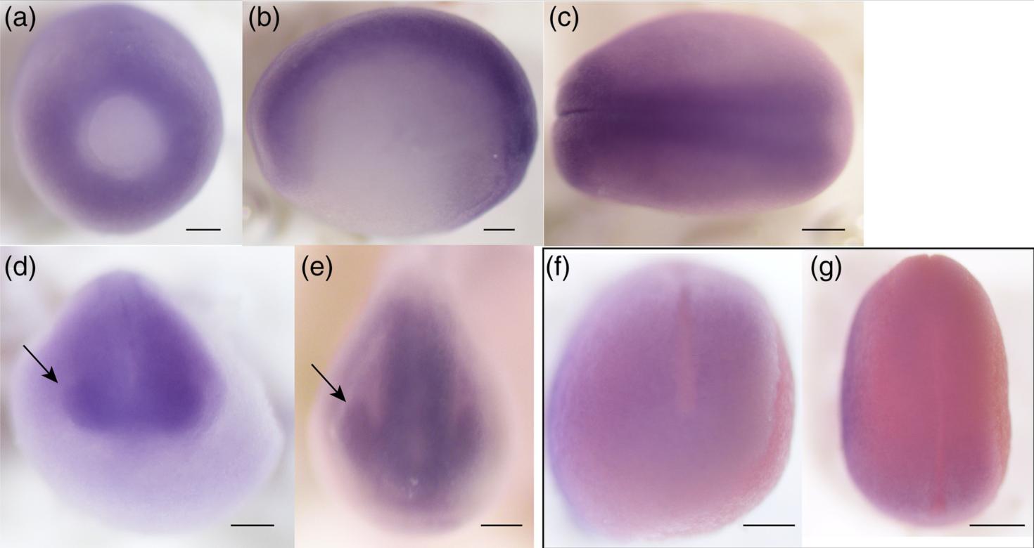 Figure 2. Expression of miRâ199aâ3p during early development. In situ hybridizations were carried out using an LNA probe to evaluate expression of mirâ199 within the eye field. (a) Vegetal view of miRâ199 expression in the circumblastoporal region at st. 11. (bâd) Dorsal, lateral, and frontal views showing expression of miRâ199 at st. 18. (e) Frontal view of miRâ199 expression at st. 23; arrows in (d) and (e) indicate expression in eyeâforming regions. (f, g â boxed) Frontal and dorsal views of st. 18 embryos that have been hybridized in situ with a control LNA probe. All scale bars approximately 250âμm. In situ hybridizations were carried out on embryos from three independent clutches. LNA, Locked nucleic acid |