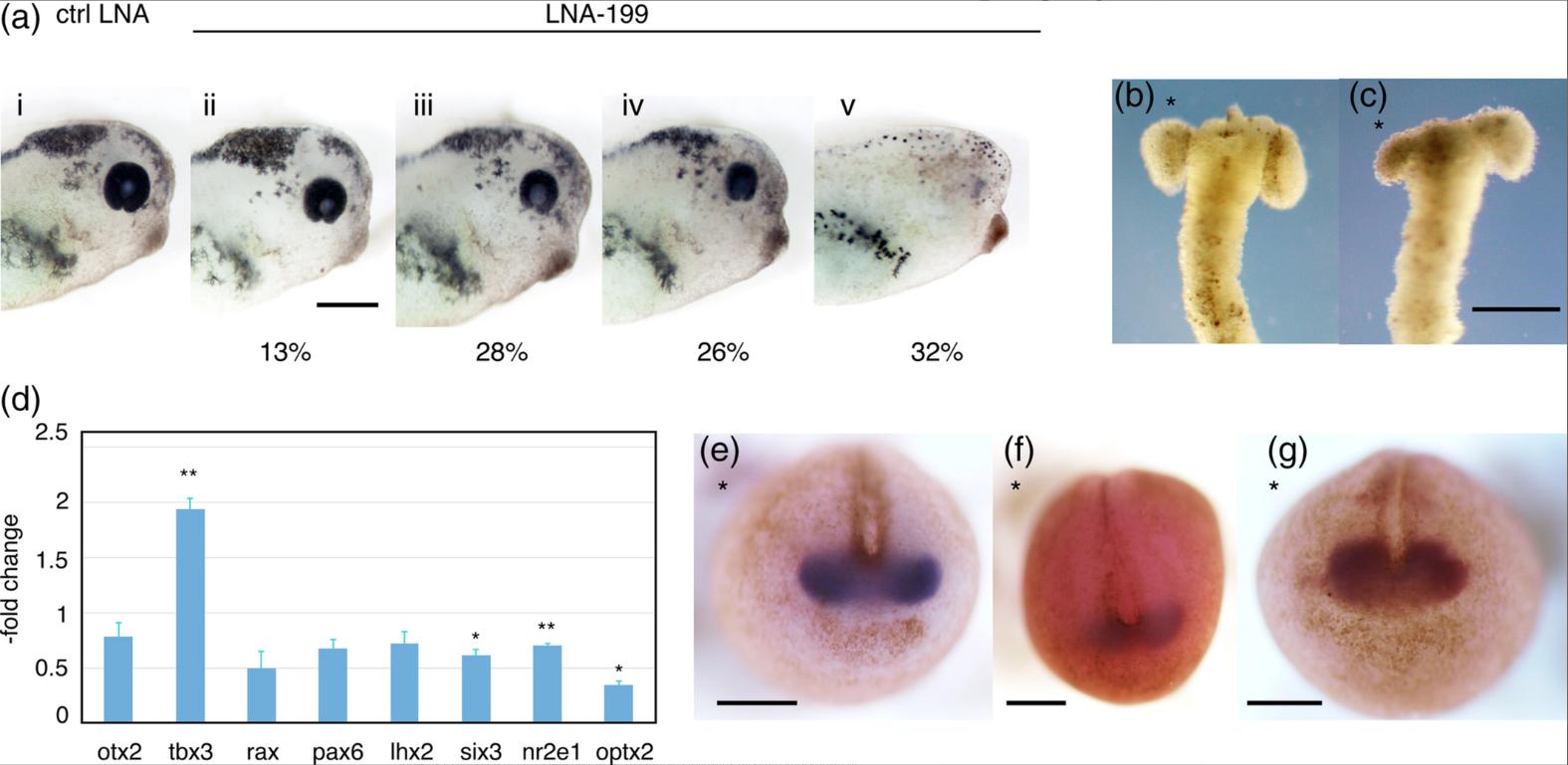 Figure 6. miRâ199 knockdown leads to defects in eye development. (a) Phenotypes of embryos injected with the LNA oligonucleotide inhibitor of miRâ199 (LNAâ199). An embryo injected with a control LNA sequence (ctrl LNA) is shown in (i); (ii)â(v) show the range of phenotypes resulting from LNAâmediated knockdown of miRâ199. Scale bar, 250âμm. The percentages showing each phenotype are indicated. (N = 76 embryos across seven independent experiments). (b and c) Neural tubes isolated at st. 24 from embryos injected unilaterally with either the control (b) or the miRâ199 (c) LNA oligonucleotide. The injected side is marked with an asterisk. Scale bar, 250âμm. (N = 4 independent experiments). (d) Quantitative RTâPCR showing expression of EFTFs and otx2 in st. 18 embryos following targeted knockdown of miRâ199. Values shown represent the meanâ±âS.E.M. of the fold difference between embryos injected with LNAâ199 and the control LNA. (N = 3 independent experiments; *pâ>â.05; **pâ>â.01; unpaired Student's t test). (eâg) In situ hybridization to show expression of the EFTFs rax (e), optx2 (f), and pax6 (g) in embryos injected unilaterally with LNAâ199. The injected side is marked with an asterisk. Scale bars, 100âμm. EFTFs, eye field transcription factors; LNA, locked nucleic acid |