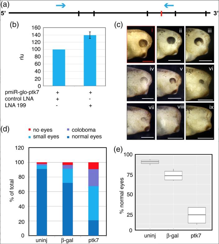 Figure 8. Overexpression of ptk7 inhibits eye development. (a) Representation of predicted miRâ199 binding sites on ptk7 3â²UTR. Red bar indicates strongest predicted target sequence. Blue arrows indicate the portion of 3â²UTR cloned into the pmiRglo (PMG) plasmid for luciferase assays. (b) Embryos were prepared by bilateral targeted injections (50âpg plasmid +1.5â2 μg LNA) and collected at stage 24 for luciferase assay. (N = 4 independent experiments, *pâ<â.05; unpaired Student's t test). Values represent meanâ±âS.E.M. (c) Representative images of St 35 tail bud embryos after ptk7 overexpression. Embryos were injected in both dorsal animal blastomeres at the 8âcell stage with 1.5â2 μg/embryo of mRNA encoding ptk7 or βâgalactosidase. Panel (i) shows results of βâgalactosidase control targeted overexpression at St 35 showing a typical eye. Panels (iiâix) show the range of phenotypes observed, from the normal phenotype in (ii) to the absence of eye formation observed in panels (viiiâix). Scale bar indicates 500âμm. (D) Quantitative representation of targeted ptk7 overexpression phenotypes from four independent experiments. Ptk7âoverexpressing embryos (n = 43) exhibit a normal eye phenotype in 22% of the population (panel ii) as compared to 91% in uninjected embryos (n = 142) and 72% in βâgalactosidase injected embryos (n = 57.) In the remainder of the embryos overexpressing ptk7, 46% exhibit a small eye (panels vâvii in c), 23% are characterized by a coloboma (panels iiiâv in c), and 9% show a loss of eye formation (panels viiiâix in c). (e) The percentage of normal eyes in each population is significantly different between ptk7âoverexpressing embryos and βâgalactosidaseâoverexpressing embryos. (**pââ¥â.001; unpaired Student's t test). Significance was calculated in R based on the percentage of normal eyes for each population for all biological replicates using ANOVA in conjunction with Tukey's HSD analysis set at a 95% confidence level) |