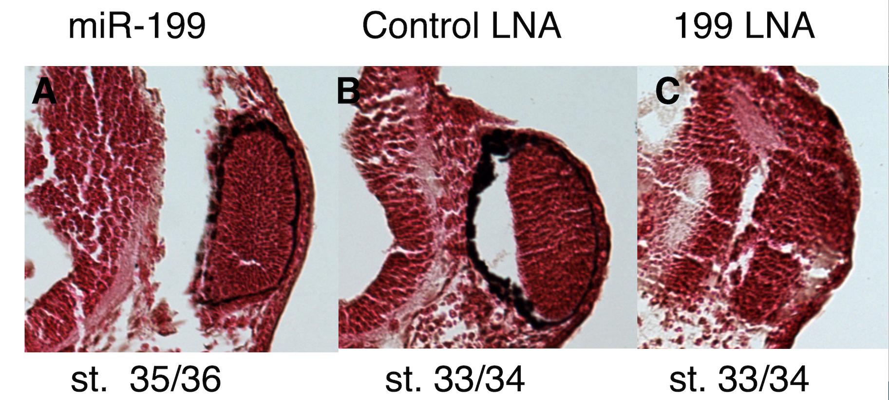 Figure S3 Gainâ or lossâofâfunction for miRâ199 yield morphologically distinct phenotypes. Sections through unilaterally injected embryos reveal differences between the eye phenotypes produced by targeted overexpression of miRâ199 (a), a control LNA (b), or LNAâ199 (c). Embryos were injected in two neighboring dorsal animal blastomeres at the 16âcell stage; asterisk indicates the injected side. Although overexpression of miRâ199 usually leads to a reduction in eye size, the optic cup forms normally and is fully separate from the neural tube (a). Introduction of LNAâ199 disrupts optic cup morphogenesis with varying degrees of severity; here (c), the optic tissue is continuous with the lateral forebrain. |
