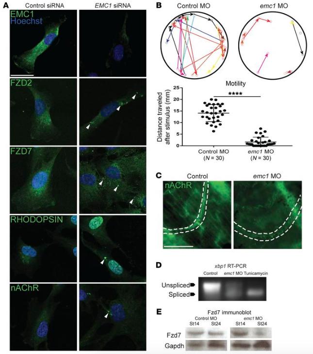 Figure 4. (A) Immunofluorescence antibody labeling of EMC1 revealed a decrease in its expression after EMC1 siRNA treatment as compared with control siRNA treatments. Multipass membrane proteins (RHODOPSIN, nAChR, FZD2, FZD7) were abnormally localized (n = 10 high power fields per marker per condition done in 3 replicates). Scale bar: 20 μm. (B) Sample traces and measurement of control morphant (n = 30) and emc1 morphant (n = 30) tadpole movement over 10 seconds after stimulation (different colors differentiate distinct tadpoles) over 3 replicates. (C) Labeling of nAChR in the proximal tail of emc1-depleted stage 45 tadpoles showed sparse and less intense expression as compared with control counterparts. Scale bar: 50 μm. (D) Splicing assay for xbp1 in pooled (n = 30 per condition) stage 24 Xenopus embryos displayed increased splicing with emc1 MO depletion compared with control embryos repeated in 4 biological replicates. Tunicamycin treatment acted as positive control. (E) Immunoblotting for Fzd7 showed similar levels of Fzd7 in pooled (n = 30 per stage per condition) emc1 morphants as compared with control morphants at stage 14, but a marked decrease in levels at stage 24. ***P < 0.0005 by Studentâs t test. Bars indicate mean and SD. |