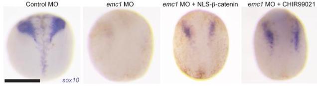 Figure 5. Expression of sox10 in control MO-injected embryos raised in media containing DMSO showed stereotyped expression of this marker at stage 20; loss of sox10 expression in stage 20 embryos was observed after injection with emc1 MO. sox10 expression was partially rescued by injection of NLS-fused β-catenin mRNA or the small molecular GSK3β inhibitor CHIR 99021. Three replicates of 15 embryos were analyzed for each condition. Scale bar: 500 μm. |