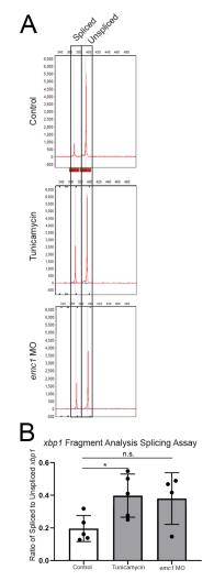 Supplemental Figure 3 Fragment analysis of xbp1 splicing demonstrates increased endoplasmic reticulum stress in emc1 morphants. (A) Examples of traces obtained from fragment analysis for xbp1 spliced and un-spliced forms in 4-5 replicates of 30 pooled stage 24 control embryos, tunicamycin (positive control) treated embryos, and emc1 morphant embryos. (B) Ratios of area under the curve measurements corresponding to peaks of spliced to unspliced forms of xbp1 in stage 24 control embryos, tunicamycin (positive control) treated embryos, and emc1 morphant embryos demonstrate an increase in xbp1 splicing in emc1 morphants. *p<0.05 by Studentâs T-test. Bars indicate mean and SD. |