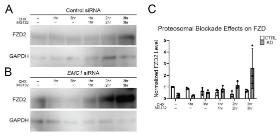 Supplemental Figure 5 Immunoblot analysis of FZD2 levels reveals proteasomal degradation as the source of FZD2 clearance in EMC1 depleted RPE cells. (A) Immunoblot of FZD2 in cells transfected with a control siRNA and subjected to either cycloheximide treatment alone or cycloheximide and MG132 proteasomal inhibition performed in 3 biological replicates. (B) Immunoblot of FZD2 in cells transfected with EMC1 siRNA and subjected to either cycloheximide treatment alone or cycloheximide and MG132 proteasomal inhibition performed in 3 biological replicates. (C) Normalized densitometry of FZD2 levels from immunoblot assays. Bars indicate mean and SD. |