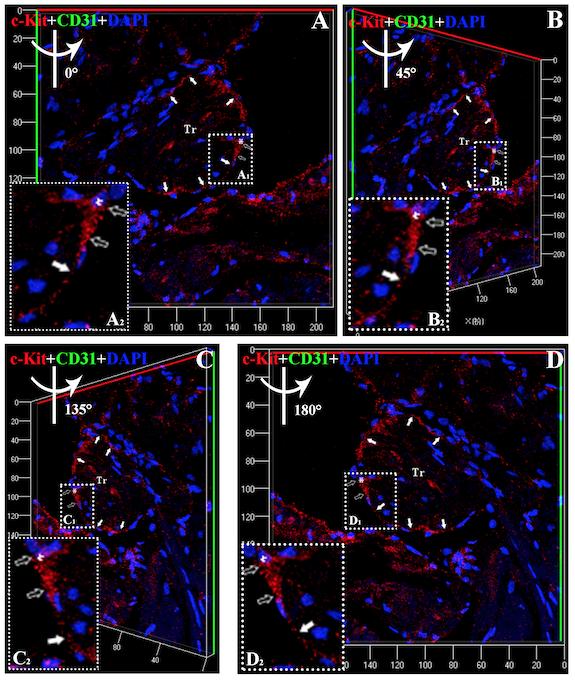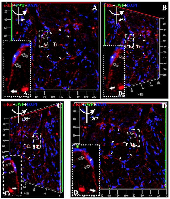 Fig. S1: Three-dimensional reconstruction of Figure 2D. A: Three-dimensional reconstruction of Figure 2 in Z-axis. B: 45 degree rotation of A in y-axis. C: 135 degree rotation of A in y-axis. D: 180 degree rotation of A in y-axis. Showing CTs (c-Kit positive) is around the trabeculae of X. tropicalis myocardium (white arrow) and the representative cell body (open arrow) and part of telopode of CTs (white arrow) in higher magnification (A2-D2) of selected area (white dot line rectangle; A1-D1) respectively. Red: anti-c-Kit; Green: anti-vWF, Blue: DAPI. Tr: Trabecula of the myocardium. |