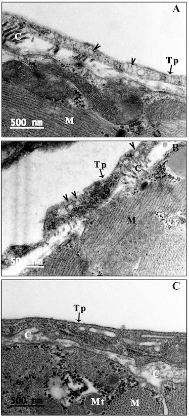 Figure 4. Vesicles and caveolae of CTs. Many vesicles (arrowhead) or coated vesicles (white arrowhead) are present in the telopodes. In addition, many caveolae are present in the membrane of the cell body and telopode (small triangle). The opening site of caveolae faces the extracellular space, and some vesicles or coated vesicles are located near the opening site of caveolae (AâC). C: Collagen and extracellular matrix; CT: Cardiac telocyte; M: Cardiomyocyte; Mt: Mitochondria; N: Nucleus. Scale bar: Size as shown in the figures; Tp: Telopode |