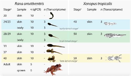 Figure 1. Overview of Rana ornativentris and Xenopus tropicalis samples used for qPCR and transcriptome analyses in this study. a R. ornativentris stage approximations based on Tahara [19,20]. b X. tropicalis stage approximations based on Nieuwkoop and Faber [23]. Full stage approximations in Table S1. Images of frogs in all figures are not to scale (source: Q. Lau for R. ornativentris, Nieuwkoop and Faber (1994) via Xenbase for X. tropicalis).
