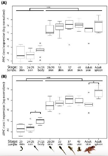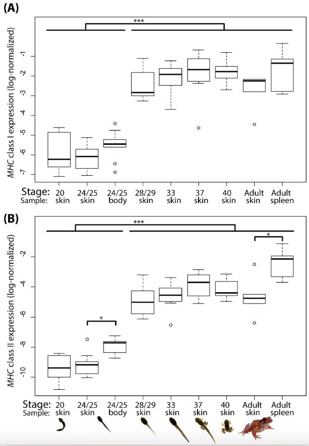 Figure 2. Boxplot of (A) MHC class I and (B) MHC class II expression in mRNA of Rana ornativentris tadpoleskin during six ontological stages and other samples: stage 24/25 body, and adult skin and spleen. MHC expression values from qPCR were normalized by the GAPDH control gene and log-transformed for normality (log-normalized). * p < 0.05, *** p < 0.0001.