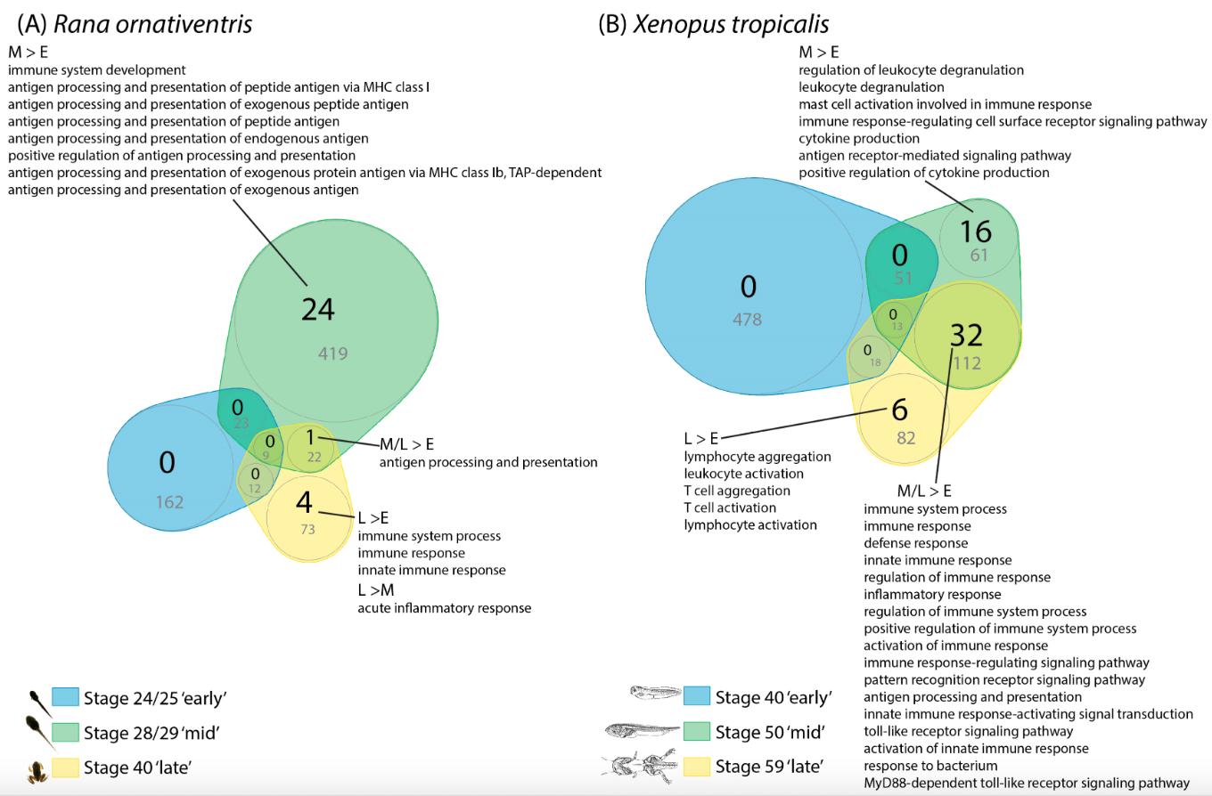 Figure 3. Venn diagrams of gene ontology (GO) terms enriched in skin of early- (E), mid- (M) and late- (L) larval stages from (A) Rana ornativentris and (B) Xenopus tropicalis. Number of immune-related enriched GO terms are in black (full list in Tables S5 and S6), and total number of enriched GO terms belonging to the âbiological processâ parent category are in grey and also represented by circle sizes. Examples of enriched immune-related GO terms are listed in comparisons between stages (full list in Tables S5 and S6).
