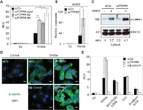 Figure 1 | PTPRK inhibits Wnt/β-catenin signaling at the receptor level (A) Topflash reporter assay in H1703 cells upon siCo, siPTPRK pool, or single siPTPRKs (siPTPRK #2, #5) transfection, with or without overnight Wnt3a treatment. Further experiments were done with siPTPRK #2. (B) qRT-PCR analysis of AXIN2 in H1703 cells treated with Wnt3a overnight upon siCo, siPTPRK transfection. (C) Western blot analysis of cytosolic β-catenin in H1703 cells upon siCo or siPTPRK transfection. Cells were treated with Wnt3a for 2 h before harvest and permeabilized with 0.05% Saponin. Ratio, relative levels of β-catenin normalized to ERK1/2. (D) Immunofluorescence microscopy showing nuclear and cytosolic β-catenin in H1703 cells. Cells were transfected with the indicated siRNAs and treated with Wnt3a for 2 h. siβ-catenin and siZNRF3/siRNF43 were used as negative and positive control, respectively. (E) Topflash reporter assay in H1703 cells upon PTPRK or β-catenin knockdown. Topflash activity was stimulated by overnight treatment of Wnt3a, or transfection of Wnt1/Fzd8/LRP6, Dvl1, or hβ-catenin S37A. Data in all graphs are displayed as means ± SD, and show one representative of multiple independent experiments with three biological replicates. RLU, relative light units. *P < 0.05 **P < 0.01, ***P < 0.001. |
