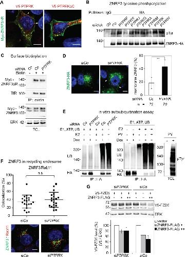Figure 6 â figure supplement 1 | PTPRK does not regulate ZNRF3 recycling. (A) Immunofluorescence microscopy showing colocalization of Myc-ZNRF3-δRING (green) with V5- PTPRK or V5-PTPRK-δC (red). Arrowheads indicate colocalization of PTPRK but not PTPRK-δC with ZNRF3 at the plasma membrane. (B) Tyrosine phosphorylation of ZNRF3 in TetOn ZNRF3-HA H1703 cells upon siRNA transfection and bafilomycin treatment overnight. (C) Cell surface biotinylation assay performed in H1703 cells transfected with Myc-ZNRF3-δR upon PTPRK knockdown. After labeling surface protein with NHS-LC-LC-Biotin, lyates were pulled down with streptavidin beads and subjected to Western blot analysis. Transferrin receptor (TfR), loading control for avidin pull down; ERK, total cell lysate (TCL) control. A representative result from three independent experiments with similar outcomes is shown. (D) Immunofluorescence microscopy (IF) showing the localization of ZNRF3-HA (green) upon PTPRK knockdown. Left, representative IF images. Arrowheads indicate plasma membrane ZNRF3. Right, quantification of membrane ZNRF3 positive cells (mean ± SD, **P < 0.01, student t-test). The number of cells per condition is indicated at the bottom (n). (E) Ubiquitin Western blot of in vitro autoubiquitination assay for ZNRF3-HA upon PTPRK knockdown (left panel) or Na-pervanadate treatment (right panel) in TetOn ZNRF3-HA cells. After 48 h of Dox treatment and 72 h of PTPRK knockdown, immunoisolated ZNRF3 was incubated as indicated. Where indicated, cells were treated with 100 μM Na-pervanadate (PV) for 30 min before harvest. A representative result of two independent experiments with similar outcomes is shown. (F) Colocalization by immunofluorescence microscopy (IF) of ZNRF3 (Green) with Rab11 (recycling endosome marker, red) in Dox treated TetOn ZNRF3-HA H1703 cells upon siRNA treatment. Top, graph shows quantification of ZNRF3 colocalizing with LAMP1 (Mean ± SD, *P < 0.05, student t-test). Bottom, representative IF images. Colocalization data are pooled from two independent experiments. (G) Western blot analysis of H1703 cells transfected as indicated. The graph shows quantification of V5- FZD5 normalized to ERK from three independent experiments (Mean ± SE, student t-test). The level of V5-FZD5 without ZNRF3-HA transfection was set to 100%. |