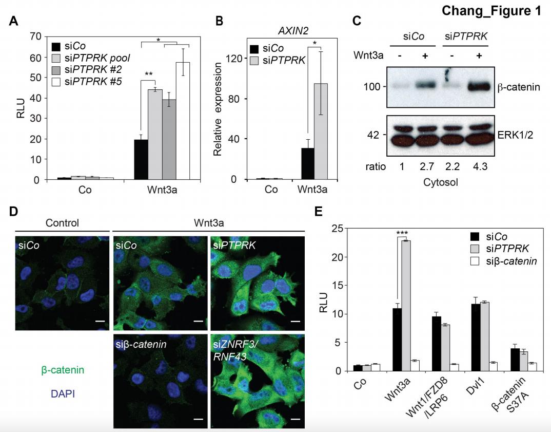 Figure 1. PTPRK inhibits Wnt/β-catenin signaling at the receptor level.(A) Topflash reporter assay in H1703 cells upon siCo, siPTPRK pool, or single siPTPRKs (siPTPRK #2, #5) transfection, with or without overnight Wnt3a treatment. Further experiments were done with siPTPRK #2. (B) qRT-PCR analysis of AXIN2 in H1703 cells treated with Wnt3a overnight upon siCo, siPTPRK transfection. (C) Western blot analysis of cytosolic β-catenin in H1703 cells upon siCo or siPTPRK transfection. Cells were treated with Wnt3a for 2 h before harvest and permeabilized with 0.05% Saponin. Ratio, relative levels of β-catenin normalized to ERK1/2. (D) Immunofluorescence microscopy showing nuclear and cytosolic β-catenin in H1703 cells. Cells were transfected with the indicated siRNAs and treated with Wnt3a for 2 h. siβ-catenin and siZNRF3/siRNF43 were used as negative and positive control, respectively. (E) Topflash reporter assay in H1703 cells upon PTPRK or β-catenin knockdown. Topflash activity was stimulated by overnight treatment of Wnt3a, or transfection of Wnt1/Fzd8/LRP6, Dvl1, or hβ-catenin S37A. Data in all graphs are displayed as means ± SD, and show one representative of multiple independent experiments with three biological replicates. RLU, relative light units. *p<0.05 **p<0.01, ***p<0.001. |
