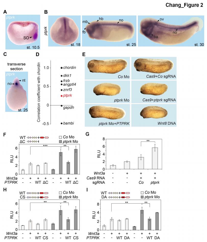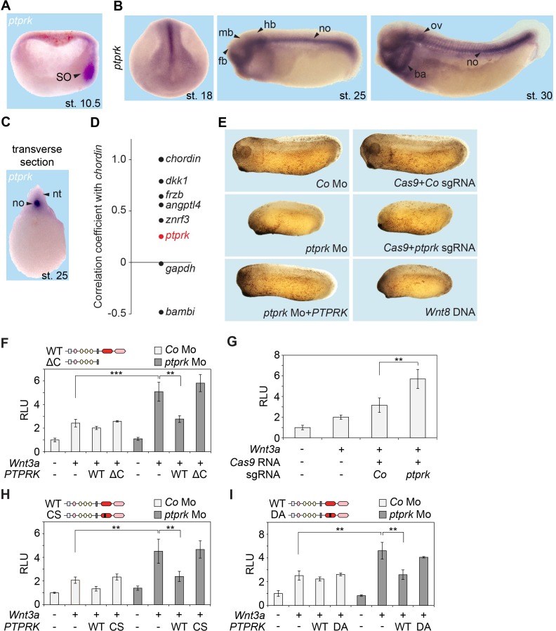 Figure 2 | Ptprk inhibits Wnt signaling in the Spemann organizer (A-C) In situ hybridization of ptprk in Xenopus tropicalis at (A) gastrula (hemisected, dorsal to the right), (B) neurula, tailbud, and tadpole stages, and in (C) transverse dissected tailbud embryo. ba, branchial arches; fb, forebrain; hb, hindbrain; mb, midbrain; no, notochord; nt, neural tube; ov, otic vesicle; SO, Spemann organizer. (D) Data mining using data from Ding et al. (2017), showing gene expression correlation with a dorsal/organizer marker chordin. Xenopus dkk1, frzb, and angptl4 are known organizer-expressed genes, gapdh is shown as housekeeping gene, and bambi is a ventrally expressed gene. (E) Representative phenotypes of tailbud stage Xenopus tropicalis embryos injected animally at 2- to 8- cell stage and as indicated. For quantification, see Figure 2 - figure supplement 1D-E. (F-I) Topflash reporter assays performed with neurulae (stage 18). Embryos were injected animally at 2- to 8-cell stage (F, H-I) or one cell stage (G) with reporter plasmids and the indicated mRNAs and Mos. Domain structures of WT PTPRK and mutants are shown on top. Normalized Topflash activity of Co930 injected embryos only with reporter plasmids was set to 1. Data in all graphs are displayed as means ± SD, and show one representative of multiple independent experiments with three biological replicates. RLU, relative light units. ** P < 0.01, ***P < 0.001. |