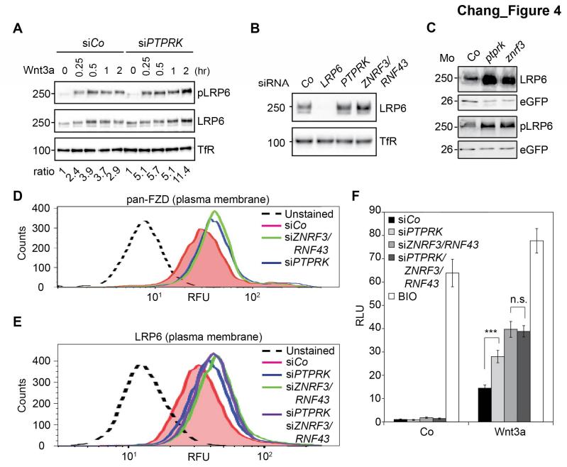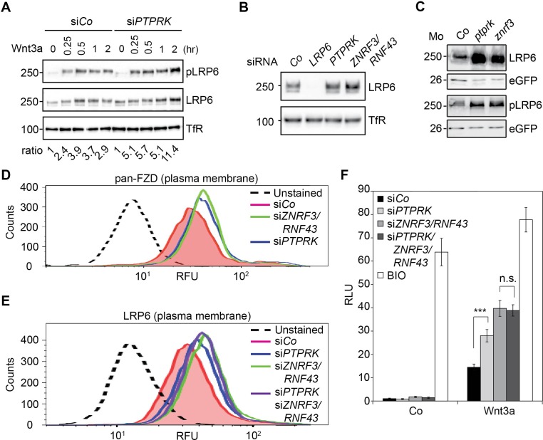 Figure 4 | PTPRK reduces Fzd and LRP6 surface levels via ZNRF3/RNF43 (A) Western blots analysis of membrane fractions from H1703 cells upon siRNA transfection. Cells were treated with Wnt3a for the indicated time and were analyzed. Ratio, phospho-LRP6 (pLRP6) levels normalized to control (transferrin receptor, TfR). Representative results from three independent experiments with similar outcome are shown. (B) Western blots analysis of membrane fractions from H1703 cells upon siRNA transfection. Transferrin receptor (TfR) served as loading control. Representative results from three independent experiments with similar outcome are shown. (C) Western blot analysis of LRP6 and phospho-LRP6 (pLRP6) in neurula (stage 18) embryos injected with LRP6 RNA, eGFP RNA and indicated Mo. eGFP served as an injection control. Data show one representative result from three independent experiments. (D) Flow cytometric analysis of cell surface Frizzled receptors (pan-Fzd antibody) in H1703 cells upon siRNA knockdown of PTPRK or ZNRF3/RNF43. Only live cells were counted and dead cells were gated out by propidium iodide (PI) staining. Dashed line, unstained H1703 cells. RFU, relative fluorescence units. (E) Flow cytometric analysis of cell surface LRP6 in H1703 cells upon siRNA depletion of PTPRK, ZNRF3/RNF43 or combination of both. Only live cells were counted and dead cells were gated out by propidium iodide (PI) staining. Dashed line, unstained H1703 cells. RFU, relative fluorescence units. (F) Topflash reporter assay in H1703 cells upon transfection of indicated siRNAs. Cells were treated with Wnt3a with or without 20 μM BIO for 24 h before measurement. (Mean ± SD, n=3; ***P < 0.001, n.s., not significant, student t-test). RLU, relative light. |