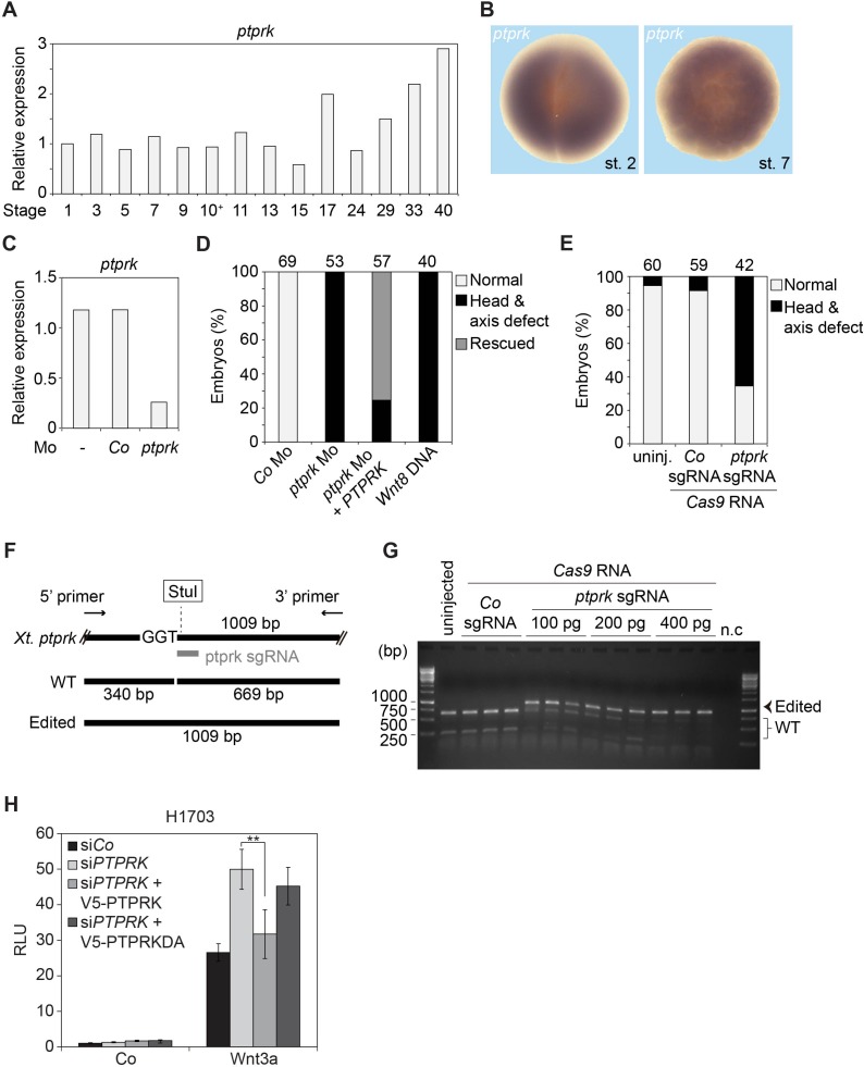 Figure 2 â figure supplement 1 | Spatiotemporal expression and knockdown of ptprk in Xenopus embryos (A) qRT-PCR analysis displaying the relative expression levels of ptprk in Xenopus tropicalis embryos at indicated stages. Expression of ptprk was normalized to odc, and the level of ptprk at stage 1 was set to 1. Data show one representative result from three independent experiments. (B) Spatial expression patterns of ptprk in Xenopus embryos at 2-cell stage (animal view) and stage 7 (animal view). (C) Knockdown efficiency of ptprk Mo. qRT-PCR analysis was performed with uninjected tailbud stage Xenopus embryos, and embryos injected with Co or ptprk Mo. (D-E) Quantification of phenotypes shown in Figure 2E. The number of embryos is indicated on the top. (F) Scheme of validation of CRISPR/Cas9-mediated genome modification by restriction enzyme digestion. Xenopus ptprk sgRNA targeted sequence contains a StuI site. A pair of primers was designed to amplify a DNA fragment of 1009 bp. After StuI digestion, wild-type (WT) but not edited DNA, yields DNA fragments of 340 bp and 669 bp. (G) Agarose electrophoresis of StuI digested PCR products described in (F). n.c, negative control, PCR product of DNA from an uninjected tailbud embryo without DNA polymerase in PCR reaction. (H) Topflash reporter assay in H1703 cells transfected with indicated siRNA and siRNA resistant V5- PTPRK or V5-PTPRK-DA. Cells were treated with control or Wnt3a for 24 h before measurement. (Mean ± SD, n=3; **P < 0.01, student t-test). |