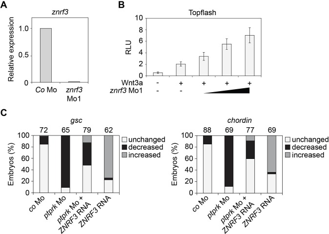 Figure 5 â figure supplement 1 | Znrf3 Mo activates Wnt signaling in Xenopus embryos (A) Knockdown efficiency of znrf3 Mo1 by qRT-PCR analysis. (B) Topflash reporter assay performed with neurula (stage 18) embryos. Embryos were injected animally at 2- to 8-cell stage as indicated. Normalized Topflash activity of Co Mo injected embryos was set to 1. (C) Quantification of the expression of the indicated genes by whole mount in situ hybridization in Figure 5D. Top, number of embryos. |