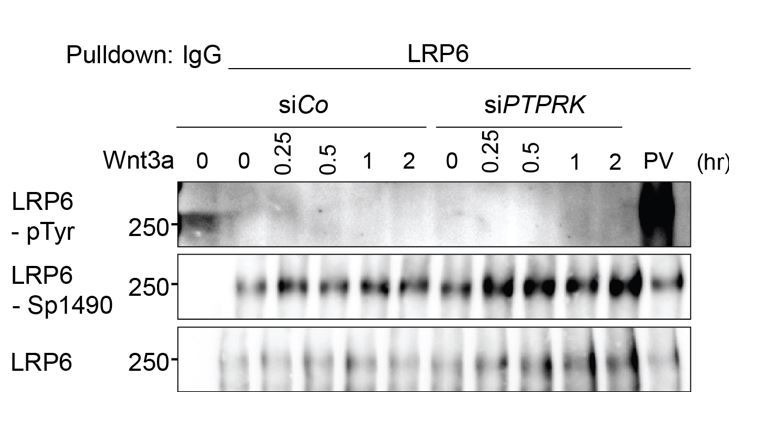 Author response image 2. PTPRK depletion does not induce LRP6 Tyrosine phosphorylation.Tyrosine phosphorylation of LRP6 in H1703 cells with Wnt3a treatment upon siRNA transfection. As a control, cells were treated with Na-pervanadate (PV, phosphatase inhibitor) for 30 min before harvest. Cells were treated with Wnt3a for the indicated time before harvest. Lysates were pulled down with anti-LRP6 antibody or control IgG and subjected to Western blot analysis. |