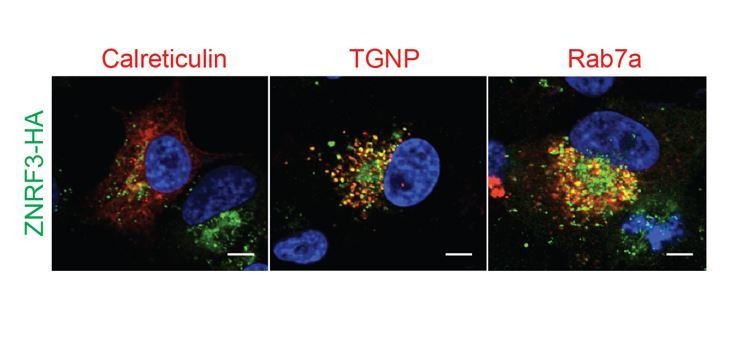 Author response image 5. PTPRK resides in secretory vesicles and endosomes.Immunofluorescence microscopy showing colocalization of ZNRF3-HA (green) with mCherry-Calreticulin, mCherry-TGNP or mCherry-Rab7a (red). |