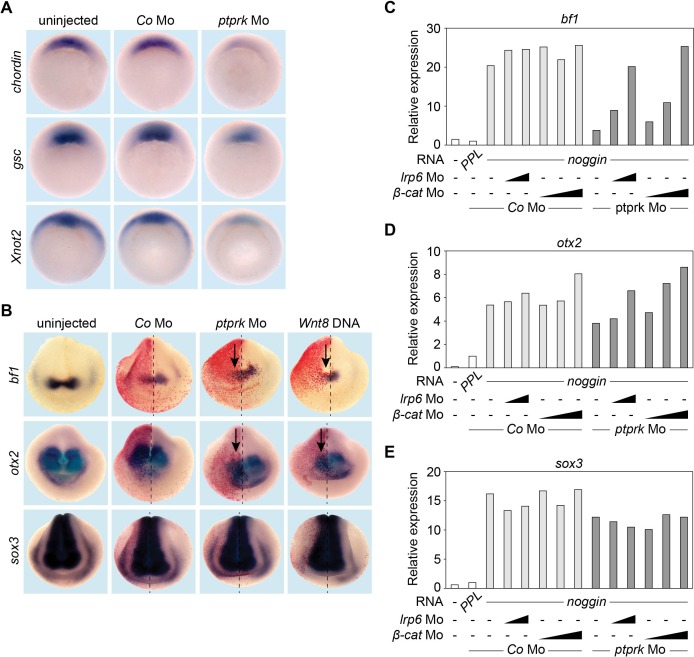 Figure 3. Ptprk regulates Spemann organizer function by inhibiting Wnt signaling.(A) Whole mount in situ hybridization of chordin, gsc, and Xnot2 in gastrula embryos (stage 10.5). Embryos were injected at 2- to 8 cell stage animally with Co or ptprk Mo. For quantification, see Figure 3—figure supplement 1A–C. (B) Whole mount in situ hybridization of forebrain marker bf1 and otx2, and pan-neural marker sox3 in neurula embryos (stage 18). Embryos were injected at 4- to 8 cell stage unilaterally in animal blastomeres as indicated (β-galactosidase lineage tracer in red; arrows mark injected side). For quantification, see Figure 3—figure supplement 1D–F. (C–E) qRT-PCR analysis showing the expression of (C) bf1, (D) otx2 and (E) sox3 in Xenopus tropicalis animal cap explants. Embryos were injected animally at 2- to 8 cell stage as indicated. Xenopus noggin mRNA was injected to induce to neural fate in animal cap explants. Animal caps were excised at stage 9 and harvested at stage 18. The expression of each gene was normalized to odc. PPL and Co Mo injected embryos were set to 1. Data show one representative experiment of at least three independent experiments with similar results. |