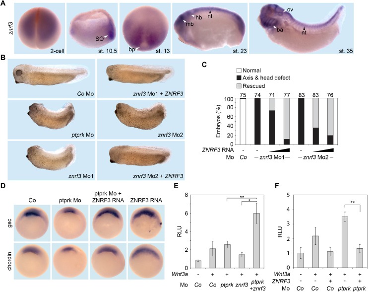 Figure 5. Znrf3 is coexpressed- and cooperates with ptprk in early Xenopus embryos.(A) Spatial expression of znrf3 in Xenopus tropicalis embryos at blastula (animal view), gastrula (hemisected dorsal to the right), neurula, tailbud and tadpole stages. ba, branchial arches; bp, blastopore; hb, hindbrain; mb, midbrain; nt, neural tube; ov, ovic vesicle; SO Spemann organizer. (B) Representative phenotypes of tailbud stage Xenopus tropicalis embryos injected animally at 2- to 8 cell stage as indicated. (C) Quantification of phenotypes shown in (B). The number of embryos per condition is indicated on the top. (D) Whole mount in situ hybridization of gsc and chordin in gastrula embryos (stage 10.5). Embryos were injected at 2- to 8 cell stage animally with Co or ptprk Mo with or without ZNRF3 RNA. For quantification, see Figure 5âfigure supplement 1C. (E) Topflash reporter assay performed with neurulae (stage 18). Embryos were injected animally at 2- to 8 cell stage as indicated. Suboptimal dosages of ptprk or znrf3 Mos were used in this experiment. Normalized Topflash activity of Co Mo injected embryos was set to 1. (F) Topflash reporter assay performed with neurulae (stage 18). Embryos were injected animally at 2- to 8 cell stage as indicated. Normalized Topflash activity of Co Mo injected embryos was set to 1. Data in all graphs are displayed as means ± SD, and show one representative of multiple independent experiments with three biological replicates. RLU, relative light units. **p<0.01.Figure 5âfigure supplement 1. Znrf3 Mo activates Wnt signaling in Xenopus embryos.(A) Knockdown efficiency of znrf3 Mo1 by qRT-PCR analysis. (B) Topflash reporter assay performed with neurula (stage 18) embryos. Embryos were injected animally at 2- to 8 cell stage as indicated. Normalized Topflash activity of Co Mo injected embryos was set to 1. (C) Quantification of the expression of the indicated genes by whole mount in situ hybridization in Figure 5D. Top, number of embryos. |