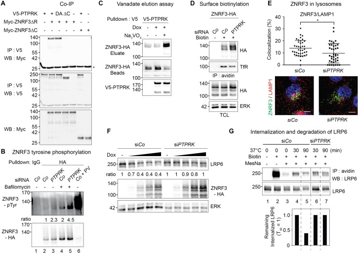 Figure 6. PTPRK binds ZNRF3 and promotes its dephosphorylation and lysosomal trafficking.(A) Co-immunoprecipitation experiments in HEK293T cells transfected with the indicated constructs and analyzed 48 hr after transfection. Data show a representative result from three independent experiments with similar outcomes. Asterisk, IgG light chain. (B) Tyrosine phosphorylation of ZNRF3 in TetOn ZNRF3-HA H1703 cells upon siRNA transfection with or without bafilomycin treatment overnight. Cells were treated with Dox for 48 hr before harvest. As a control, cells were treated with Na-pervanadate (PV, phosphatase inhibitor) for 30 min before harvest. Lysates were pulled down with anti-HA antibody or control IgG and subjected to Western blot analysis. Ratio, tyrosine phosphorylation of ZNRF3 normalized to total ZNRF3. (C) PTPRK-ZNRF3 interaction is vanadate-sensitive. Immobilized, immunoisolated V5-PTPRK from TetOn V5-PTPRK cells was incubated with total cell lysate from ZNRF3-HA expressing, Na-pervanadate treated cells. Bound ZNRF3-HA was eluted with 20 mM vanadate as indicated and eluate and beads were separated before Western blot analysis. (D) Cell surface biotinylation assay performed in TetOn ZNRF3-HA H1703 cells upon siRNA treatment. Cells were treated with Dox for 48 hr before harvest. After labeling surface proteins with Sulfo-NHS-LC-LC-Biotin, lysates were pulled down with streptavidin beads and subjected to Western blot analysis. Transferrin receptor (TfR), loading control for avidin pull down; ERK, total cell lysate (TCL) control. A representative result from three independent experiments with similar outcomes is shown. (E) Colocalization by immunofluorescence microscopy (IF) of ZNRF3 (Green) with LAMP1 (Red) in TetOn ZNRF3-HA H1703 cells upon siRNA treatment. Top, graph shows quantification of ZNRF3 colocalizing with LAMP1 (Mean ± SD, *p<0.05, student t-test). Bottom, representative IF images. Note that plasma membrane localized ZNRF3 cannot be seen due to low microscope laser power used for optimal vesicular co-localization in. Colocalization data are pooled from two independent experiments. (F) Western blot analysis of Dox treated TetOn ZNRF3-HA H1703 cells upon siRNA treatment. Ratio, LRP6 normalized to ERK. A representative result from three independent experiments with similar outcomes is shown. (G) Internalization and degradation assay of LRP6 in TetOn ZNRF3-HA H1703 cells treated as indicated. After labeling of surface proteins with Sulfo-NHS-SS-Biotin, endocytosis was induced by shifting cells to 37°C for the indicated times. At each indicated time point, cells were treated with MesNa to remove biotinylated surface proteins and then harvested. Cells were lysed, and biotinylated proteins were pulled down with streptavidin beads and analyzed with indicated antibodies. Lane 1: non-biotin treated control, Lane 3: MesNa treated after biotin labeling without inducing endocytosis (monitoring MesNa efficiency). The graph below shows avidin pulled down LRP6 levels normalized to total LRP6 levels (remaining internalized LRP6 at 30 min upon siCo was set to 1).Figure 6âfigure supplement 1. PTPRK regulates ZNRF3 trafficking but not its intrinsic E3 ligase activity.(A) Immunofluorescence microscopy showing colocalization of Myc-ZNRF3-ÎRING (green) with V5-PTPRK or V5-PTPRK-ÎC (red). Arrowheads indicate colocalization of PTPRK but not PTPRK-ÎC with ZNRF3 at the plasma membrane. (B) Tyrosine phosphorylation of ZNRF3 in TetOn ZNRF3-HA H1703 cells upon siRNA transfection and bafilomycin treatment overnight. (C) Cell surface biotinylation assay performed in H1703 cells transfected with Myc-ZNRF3-ÎR upon PTPRK knockdown. After labeling surface protein with NHS-LC-LC-Biotin, lyates were pulled down with streptavidin beads and subjected to Western blot analysis. Transferrin receptor (TfR), loading control for avidin pull down; ERK, total cell lysate (TCL) control. A representative result from three independent experiments with similar outcomes is shown. (D) Immunofluorescence microscopy (IF) showing the localization of ZNRF3-HA (green) upon PTPRK knockdown. Left, representative IF images. Arrowheads indicate plasma membrane ZNRF3. Right, quantification of membrane ZNRF3 positive cells (mean ± SD, **p<0.01, student t-test). The number of cells per condition is indicated at the bottom (n). (E) Ubiquitin Western blot of in vitro autoubiquitination assay for ZNRF3-HA upon PTPRK knockdown (left panel) or Na-pervanadate treatment (right panel) in TetOn ZNRF3-HA cells. After 48 hr of Dox treatment and 72 hr of PTPRK knockdown, immunoisolated ZNRF3 was incubated as indicated. Where indicated, cells were treated with 100 μM Na-pervanadate (PV) for 30 min before harvest. A representative result of two independent experiments with similar outcomes is shown. (F) Colocalization by immunofluorescence microscopy (IF) of ZNRF3 (Green) with Rab11 (recycling endosome marker, red) in Dox treated TetOn ZNRF3-HA H1703 cells upon siRNA treatment. Top, graph shows quantification of ZNRF3 colocalizing with LAMP1 (Mean ± SD, *p<0.05, student t-test). Bottom, representative IF images. Colocalization data are pooled from two independent experiments. (G) Western blot analysis of H1703 cells transfected as indicated. The graph shows quantification of V5-FZD5 normalized to ERK from three independent experiments (Mean ± SE, student t-test). The level of V5-FZD5 without ZNRF3-HA transfection was set to 100%. |