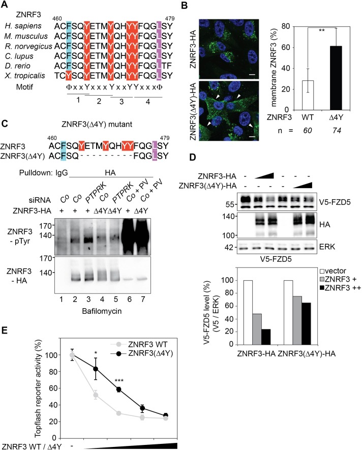Figure 7. A "4Y" endocytic motif in ZNRF3 is regulated by PTPRK.(A) Multiple sequence alignment of ZNRF3 among different species. Y: Tyrosine, X: any amino acids, and Φ: hydrophobic bulky amino acids. (B) Subcellular localization by immunofluorescence microscopy (IF) of ZNRF3-HA or ZNRF3(Î4Y)-HA in H1703 cells with bafilomycin treatment overnight. Left, representative IF images. Arrowheads indicate membrane ZNRF3. Right, graph shows quantification of membrane ZNRF3 positive cells (Mean ± SD, **p<0.01, student t-test). The number of cells per condition is indicated at the bottom (n). IF data are pooled from two independent experiments. (C) Tyrosine phosphorylation of ZNRF3-HA or ZNRF3(Î4Y)-HA in H1703 cells upon siRNA transfection with bafilomycin treatment overnight. As a control, cells were treated with Na-pervanadate (PV, phosphatase inhibitor) for 30 min before harvest. Lysates were pulled down with anti-HA antibody or control IgG and subjected to Western blot analysis. (D) Western blot analysis of H1703 cells transfected as indicated. The graph below shows quantification of V5-FZD5 normalized to ERK. The level of V5-FZD5 without ZNRF3-HA transfection was set to 100%. A representative result from two independent experiments with similar outcomes is shown. (E) Topflash reporter assay in H1703 cells upon transfection of different amount of ZNRF3-HA or ZNRF3(Î4Y)-HA plasmids. All samples were Wnt3a treated for 24 hr before measurement. (Mean ± SD, n = 3; *p<0.05, ***p<0.001, student t-test). Topflash activity without ZNRF3 transfection was set to 100%. A representative result from three independent experiments with similar outcomes is shown.Figure 7âfigure supplement 1. The ZNRF3(4YF) mutant resists PTPRK regulation and shows reduced Wnt signal inhibition.(A) Tyrosine phosphorylation of the indicated Wt and mutant ZNRF3 constructs in H1703 cells upon siRNA transfection and bafilomycin treatment overnight. As control, cells were treated with Na-pervanadate (PV, phosphatase inhibitor) for 30 min before harvest. Lysates were pulled down with anti-HA antibody or control IgG and subjected to Western blot analysis. (B) Topflash reporter assay in H1703 cells upon transfection of different amount of the indicated Wt and mutant ZNRF3 plasmids. All samples were Wnt3a treated for 24 hr before measurement. (Mean ± SD, n = 3; **p<0.005, ***p<0.001, student t-test). Topflash activity without ZNRF3 transfection was set to 100%. A representative result from three independent experiments with similar outcomes is shown. |
