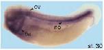 znrf3 (zinc and ring finger 3) gene expression in Xenopus tropicalis embryo, assayed via in situ hybridization, NF stage 23, lateral view, anterior left, dorsal up. |