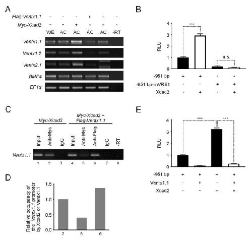 Fig. 3. Xcad2 up-regulates Ventx1.1 transcription by occupying VRE1. (A) Animal caps from embryos injected or not with Flag-Ventx1.1 (500 pg) and/or Myc-Xcad2 (1 ng) mRNA as indicated were subjected to RT-PCR analysis at stage 11.5. (B–E) One-cell stage embryos were injected with indicated combinations of −951-bp reporter, −951-bp-mVRE1 reporter, Flag-Ventx1.1 (500 pg), and Myc-Xcad2 (1 ng) and cultured to stage 11 for ChIP-PCR (C, D) or stage 11.5 for luciferase reporter assay (B, E). (D) Quantification of relative intensities of bands in lanes 2, 5, and 6 shown in (C). |