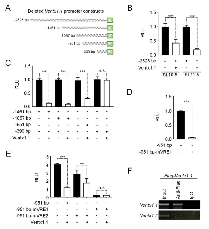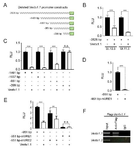 Fig. 2. Identification of a Ventx1.1-responsive element (VRE) in its own promoter region. (A) Diagram of Ventx1.1 promoter deletion constructs. The length that each promoter fragment extends upstream of the major Ventx1.1 transcription initiation site is indicated at left. Each promoter fragment was fused to luciferase (LUC) reporter gene. (B–E) Embryos were injected at one-cell stage with wild-type or putative VRE-mutated Ventx1.1 promoter deletion constructs alone or with Flag-Ventx1.1 mRNA (500 pg) as indicated, cultured to stage 10.5 (B) or 11.5 (B–E), and harvested for luciferase reporter assays. All relative promoter activity data are shown as mean ± standard error (SE). (F) ChIP-PCR analysis showing the occupancy by Ventx1.1 of its own promoter region. Ventx1.2, a negative control for PCR, was amplified using its coding region-specific primers. IgG, a negative control IgG. |
