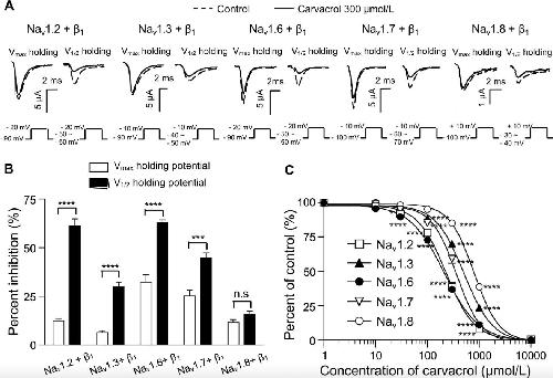 Fig. 1. (A) Effects of carvacrol on peak sodium inward currents in Xenopus oocytes expressing Nav1.2, Nav1.3, Nav1.6, Nav1.7 and Nav1.8 α subunits with β1 subunit at two holding potentials. Representative traces are shown. Sodium currents were evoked by 50 ms depolarizing pulses to â20 mV for Nav1.2 and Nav1.6, â10 mV for Nav1.3 and Nav1.7, and +10 mV for Nav1.8 from Vmax or V1/2 in both the absence and presence of 300 μmol/L of carvacrol (B) Percentage inhibition of sodium currents of carvacrol were calculated (n = 6). Open columns represent the effect at Vmax holding potential and closed columns indicate the effect at V1/2. Data are presented as means ± SEM. ***P < 0.001, ****P < 0.0001 compared to the control, based on unpaired t-test (two-tailed) (C) Concentration-response curves for inhibitory effects of carvacrol on sodium currents elicited by 50 ms depolarizing pulses to â20 mV for Nav1.2 and Nav1.6, â10 mV for Nav1.3 and Nav1.7, +10 mV for Nav1.8 α subunits with β1 subunit from V1/2 holding potential (n = 6). The peak current amplitude in the presence of carvacrol was normalized to that of the control and the effects are expressed as percentages of the control. Data are presented as means ± SEM. *P < 0.05, ****P < 0.0001 compared to the control, based on one-way analysis of variance (ANOVA) followed by Dunnett post hoc test. IC50 values and Hill coefficients were calculated using GraphPad Prism. IC50 = half maximal inhibitory concentration; Nav = voltage-gated sodium channel; Vmax holding potential = holding potential causing maximal current; V1/2 holding potential = holding potential causing half-maximal current.