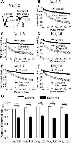 Fig. 5. Use-dependent blockage of sodium channels on Nav1.2, Nav1.3, Nav1.6, Nav1.7, and Nav1.8 α subunits with β1 subunit by carvacrol (n = 6). Currents were elicited at 10 Hz by a 20 ms depolarizing pulse of â20 mV for Nav1.2 and Nav1.6, â10 mV for Nav1.3 and Nav1.7, and +10 mV for Nav1.8 from a V1/2 holding potential in both the absence and presence carvacrol. (A) Representative INa traces from oocytes expressing Nav1.2 α subunit with the β1 subunit in both the absence and presence of carvacrol are shown. Peak currents were measured and normalized to the first pulse and plotted against the pulse number (B, Nav1.2; C, Nav1.3; D, Nav1.6; E, Nav1.7; F, Nav1.8). Closed circles and open circles represent control and the effect of carvacrol, respectively (G) Data were fitted to the monoexponential equation and values for fractional blockage of the plateau of normalized INa are shown (open columns and closed columns represent control and the effect of carvacrol, respectively). Data are expressed as means ± SEM. ***P < 0.001, compared to the control, based on paired t-test (two-tailed). Nav = voltage-gated sodium channel.