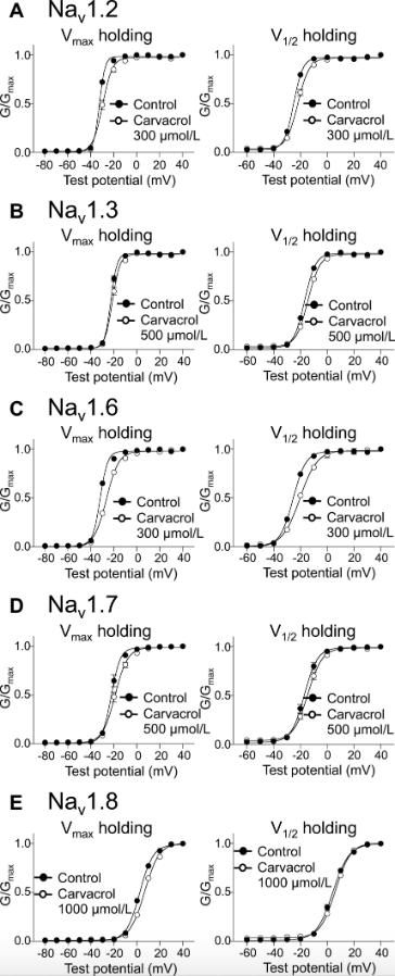 Fig. 3. Effects of carvacrol on channel activation in oocytes expressing Nav1.2 (A), Nav1.3 (B), Nav1.6 (C), Nav1.7 (D), and Nav1.8 (E) α subunits with β1 subunit from Vmax or V1/2 holding potentials (n = 6). Closed circles and open circles represent control and the effect of carvacrol, respectively. Data are expressed as means ± SEM. Activation curves were fitted to the Boltzmann equation; V1/2 is shown in Table 1. Nav = voltage-gated sodium channel; Vmax holding potential = holding potential causing maximal current; V1/2 holding potential = holding potential causing half-maximal current.