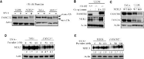 Figure 2. The relationship between the NEIL3 and the FA/BRCA pathways in psoralen-ICL repair. (A) WT and NEIL3-/- cells were treated with PUVA (pre-incubated with 50 nM psoralen for 30 min and then irradiation with 0.8 J/cm2 UVA). 24 h after PUVA, the level of FANCD2 mono-ubiquitination was detected by WB to determine activation of the FA/BRCA pathway. (B) U2OS-FANCD2-/- cells were complemented with EGFP-FANCD2 and NEIL3 expression level was determined by western blot in those cells. (C) The FANCA and FANCD2 expression levels were determined in wild-type and NEIL3 deficiency cells. (D, E) The NEIL3 expression level was determined in wild-type and FANC gene deficiency cells, 24 h after being treated with indicated dose of psoralen plus UVA (0.8 J/cm2) irradiation. Quantification of the Western blots was performed by ImageJ software and data were normalized to no psoralen.