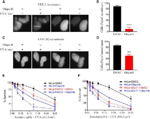 Figure 4. PARP is essential for NEIL3 recruitment to psoralen-ICLs and facilitates FANCD2 recruitment. (A) Recruitment of NEIL3 to PUVA laser tracts. U2OS cells expressing NEIL3-GFP were pre-incubated with 10 μM psoralen and the recruitment of NEIL3 was visualized 1 min after exposure to UVA laser. PARP inhibitor (olaparib) was added 1 hour before laser striping. (B) Quantification of the NEIL3 recruitment to psoralene-ICL laser tracts after treatment with DMSO or olaparib. A total of 100 cells were quantified for each group. (C) U2OS cells stably expressing EGFP-FANCD2 were pre-treated with 10 μM psoralen for 1 h before laser striping. Recruitment efficiency was determined 10 min after exposure to UVA laser. Olaparib or DMSO was added 1 h before laser striping. (D) Quantification of the recruitment efficiency of EGFP-FANCD2 after treatment with DMSO or olaparib, as shown in (C). A total of 100 cells were counted for each group. (E, F) PUVA sensitivity was determined in WT, FANCA-/- and NEIL3-/- HeLa cells after DMSO or olaparib treatment. CellTiter-Glo cell viability assays were performed. Mean and s.e.m. of three independent experiments are shown. **P < 0.01; ***P < 0.001 (paired t test).