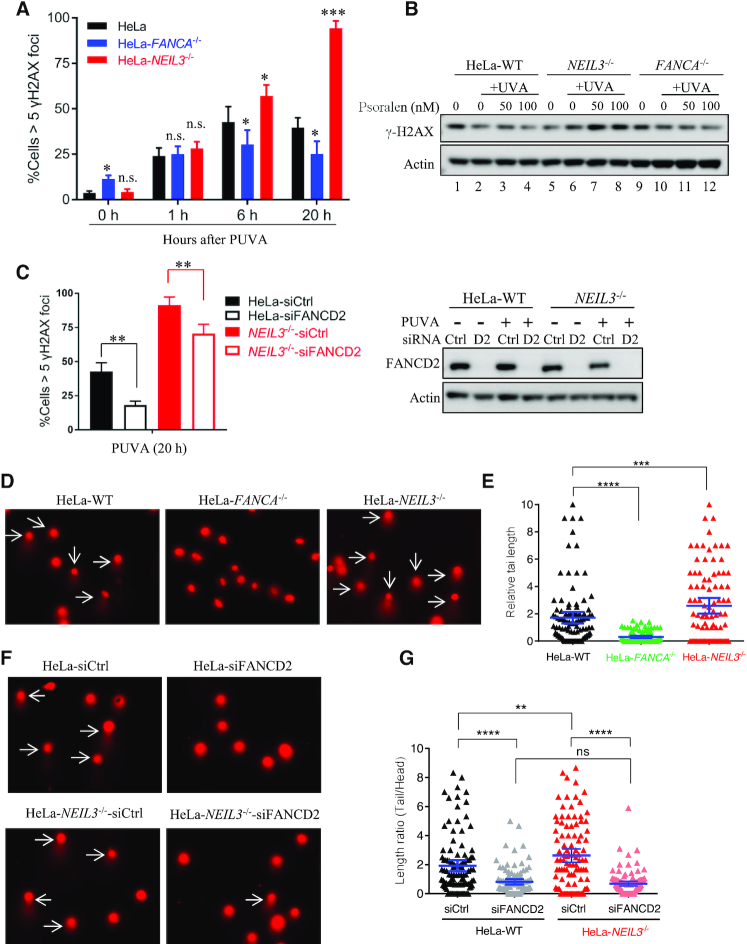 -/- cells show increased DSBs compared to WT cells after PUVA treatment. (A) Quantification of the γH2AX foci at 0, 1, 6 and 20 h after PUVA. Cells with more than five γH2AX foci were counted and quantified, from IF image shown in Figure S3. Data are mean ± s.e.m. from three independent experiments. (B) γH2AX level was determined in WT, FANCA-/- and NEIL3-/- HeLa cells after treatment. (C) Quantification and statistical analysis of the γH2AX foci 20 h after PUVA in WT and NEIL3â/- HeLa cells after FANCD2 knockdown. Data are mean ± s.e.m. from three independent experiments. Western blot on the right shows the knockdown of FANCD2. PUVA, 50 nM psoralen + 0.8 J/cm2 UVA. **P < 0.01 (paired t test). (D) Representative images of comets, showing tail formation (arrows) 4 h after PUVA in WT, FANCA-/- and NEIL3-/- HeLa cells. (E) Quantification of the comet length at 4 h after PUVA shown in (D). At least 100 cells were analyzed for each group. (F) Representative images of comets showing tail formation in WT and NEIL3-/- HeLa cells after FANCD2 knockdown and PUVA. 72 h after siRNA transfection, cells were treated with PUVA and released for 4 h before comet assays. PUVA, 10 μM psoralen plus 1.0 J/cm2 UVA; White arrows, cells with comet tails. (G) Quantification and statistical analysis of comet lengths from experiments shown in (F). ns, not significant, **P < 0.01, ****P < 0.0001 (paired t test).