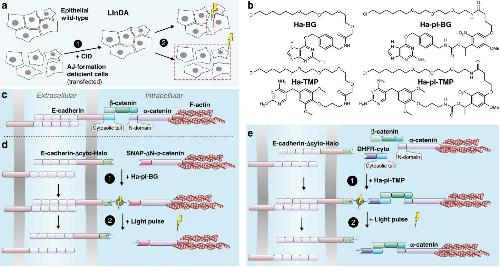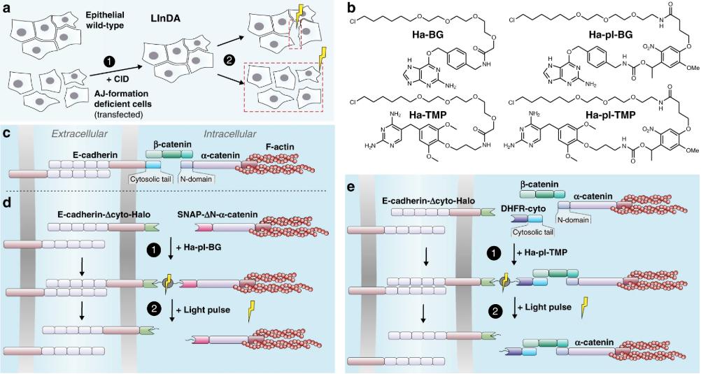 Fig. 1: Design of the setup for Light-Induced Dissociation of Adherens junctions (LInDA). a) The chemically induced dimerization (CID, 1) of two different proteins or of two parts of a split variant of a protein at adherens junctions (AJ) leads to formation of functional AJs and cell compaction. The dimeric complex is cleaved with light of appropriate wavelength (350â405ânm) in subcellular regions or larger areas (2), leading to AJ dissociation and cell dissemination. b) Chemical structures of the photostable dimerizer Ha-BG and Ha-TMP, and the photocleavable dimerizer Ha-pl-BG and Ha-pl-TMP. c) In endogenous AJ, β-catenin facilitates the connection between E-cadherin and α-catenin. d) The β-catenin binding domains of E-cadherin and α-catenin were replaced by Halo tag and SNAP tag, respectively. Addition of Ha-pl-BG induces the formation of an E-cadherin-α-catenin heterodimer; application of 350â405ânm light pulse leads to complex dissociation. e) The E-cadherin receptor was split in two parts, where the cytosolic juxtamembrane domain is fused with a Halo tag and the cytosolic tail fused to a DHFR tag. Addition of Ha-pl-TMP induces the reconstitution of the receptor, the binding of β-catenin at AJs and the further recruitment of α-catenin/actin complex. The dissociation is then triggered by application of 350â405ânm light pulse. |